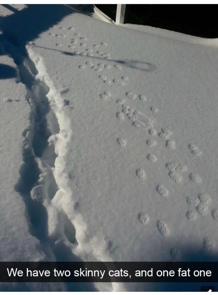 A lovely and funny Facebook post about housecat tracks in the snow, and I love cats, but what does my brain focus on? The weird shadow that is cast over the cat tracks that is probably an innocent loop of rope but in my brain is clearly a hangman’s noose. After viewing the post, I kept reading the caption over and over to try and make sense of the shadow of the noose, as that was what the post was about, in my brain. It took me awhile to understand that the focus was cat tracks in the snow, as the caption clearly explained, and not the shadow, a shadow that most other people probably do not realize is even there, as focused as they are on the intended and appropriate image—cute cat tracks!!! And . . . I . . . LOVE . . . CATS, that is how much my brain has to be fucked-up!!! How can I miss anything about cats?!